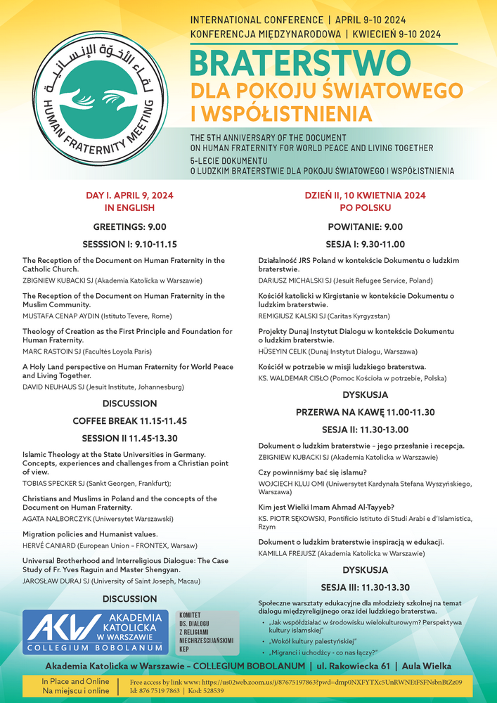 Cel: Konferencja oferuje wieloaspektową refleksję nad Dokumentem o ludzkim braterstwie dla pokoju światowego i współistnienia – jego treścią, recepcją, możliwościami, wyzwaniami oraz inspiracjami o charakterze akademickim, praktycznym i edukacyjnym.