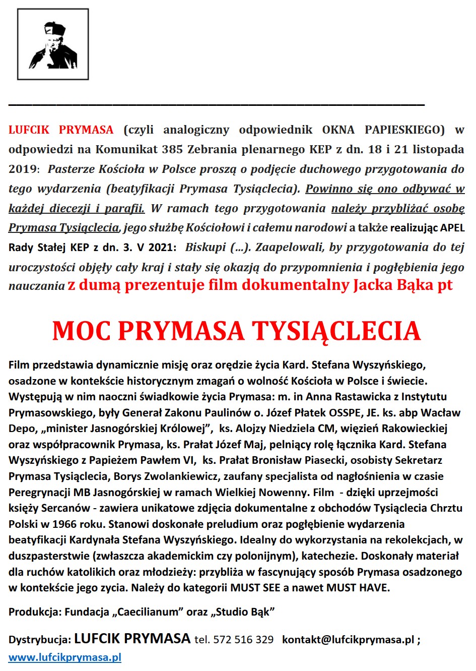 9.00 - Pokaz premierowy filmu "Moc Prymasa Tysiąclecia" w reż. Jacka Bąka (45 min.)
