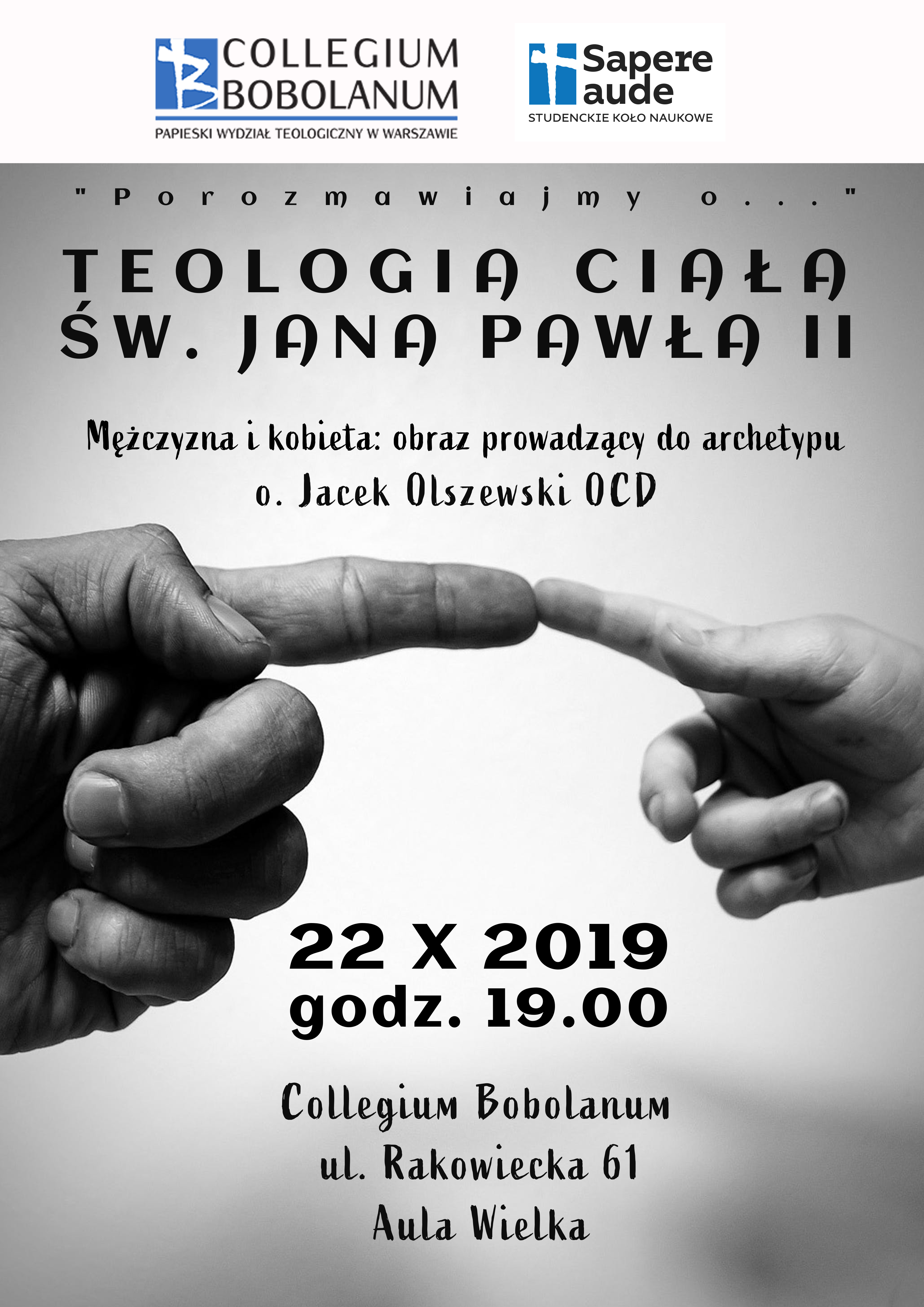 22 października 2019 r. we wtorek o godz. 19.00 zapraszamy do Auli Wielkiej na spotkanie organizowane przez Studenckie Koło Naukowe Sapere Aude z cyklu Teologia ciała Jana Pawła II: "Mężczyzna i kobieta: obraz prowadzący do archetypu". Sesję prowadzi o. Jacek Olszewski OCD - proboszcz parafii św. Trójcy na Solcu. Wstęp wolny.
