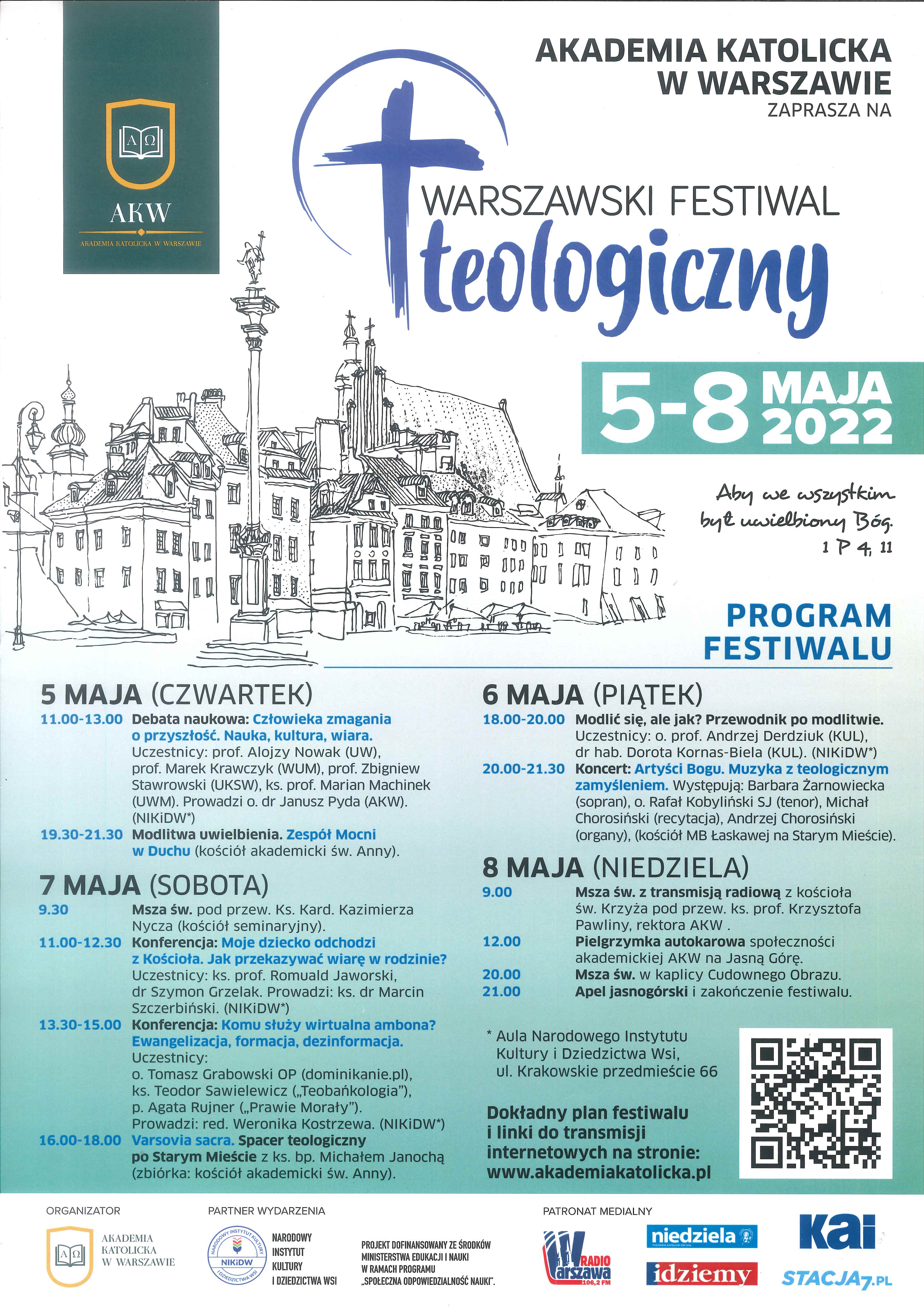 W dniach 5-8 maja 2022 roku odbędzie się Warszawski Festiwal Teologiczny organizowany przez Akademię Katolicką w Warszawie. Chcemy, aby stał się świętem teologii – nauki, która rozświetla drogi prowadzące do Boga i do drugiego człowieka. Zapraszamy do zapoznania się z propozycjami spotkań i do wspólnego świętowania.