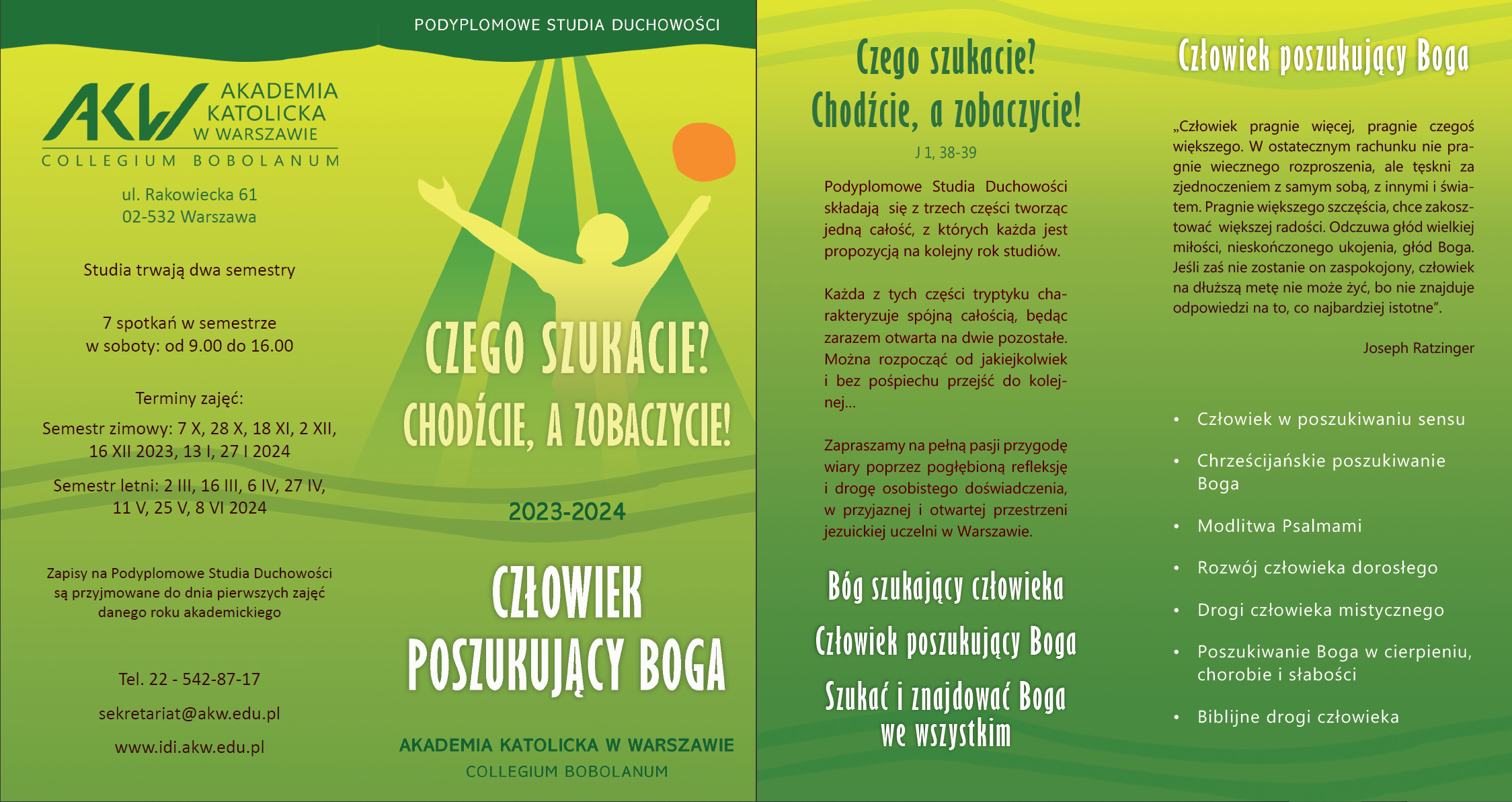 Podyplomowe Studia Duchowości składają się z trzech części tworząc jedną całość, z których każda jest propozycją na kolejny rok studiów. Każda z tych części tryptyku charakteryzuje się spójną całością, będąc zarazem otwarta na dwie pozostałe. Można rozpocząć od jakiejkolwiek i bez pośpiechu przejść do kolejnej… Zapraszamy na pełną pasji przygodę wiary poprzez pogłębioną refleksję i drogę osobistego doświadczenia, w przyjaznej i otwartej przestrzeni jezuickiej uczelni w Warszawie. Człowiek poszukujący Boga Bóg szukający człowiekaCzłowiek poszukujący Boga. Szukać i znajdować Boga we wszystkim.