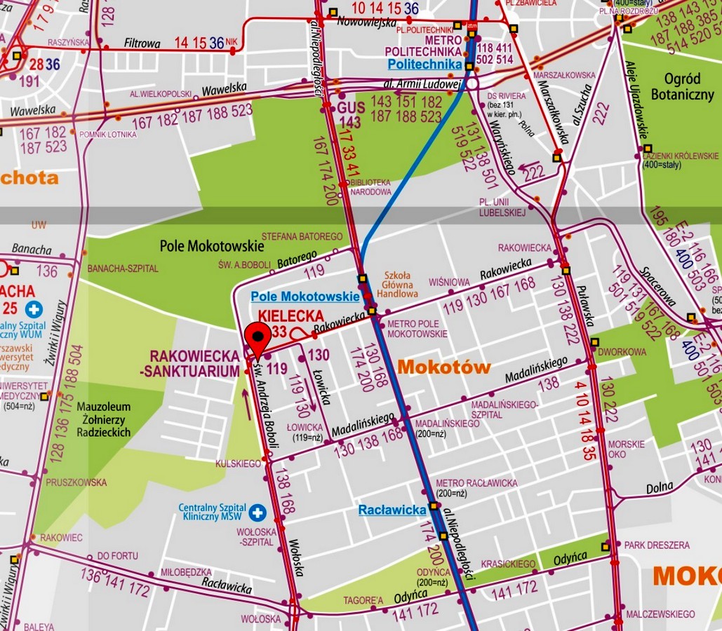 - Mamy doskonałą lokalizację z dojazdem metrem (Metro Pole Mokotowskie), autobusem (119, 130, 138, 167, 168, 174, 200, N34, N36) i tramwajem (17, 33, 41). Dojazd z uczelni do Dworca Centralnego PKP w Warszawie zajmuje 15-30 minut. Nawet w weekendy i święta tramwaje kursują częściej niż co 10 min i zatrzymują się przed wejściem do uczelni. Uczelnia mieści się w jednym budynku, przy narodowym Sanktuarium św. Andrzeja Boboli, w pobliżu dużego warszawskiego parku (Pole Mokotowskie) i niedaleko Biblioteki Narodowej. Przy ul. Rakowieckiej znajduje się wiele sklepów, kawiarenki, bary, apteki, punkt ksero i inne punkty usługowe, które dają studentom możliwość spędzenia wolnego czasu, załatwienia różnych spraw, zjedzenia posiłku i spotkań.